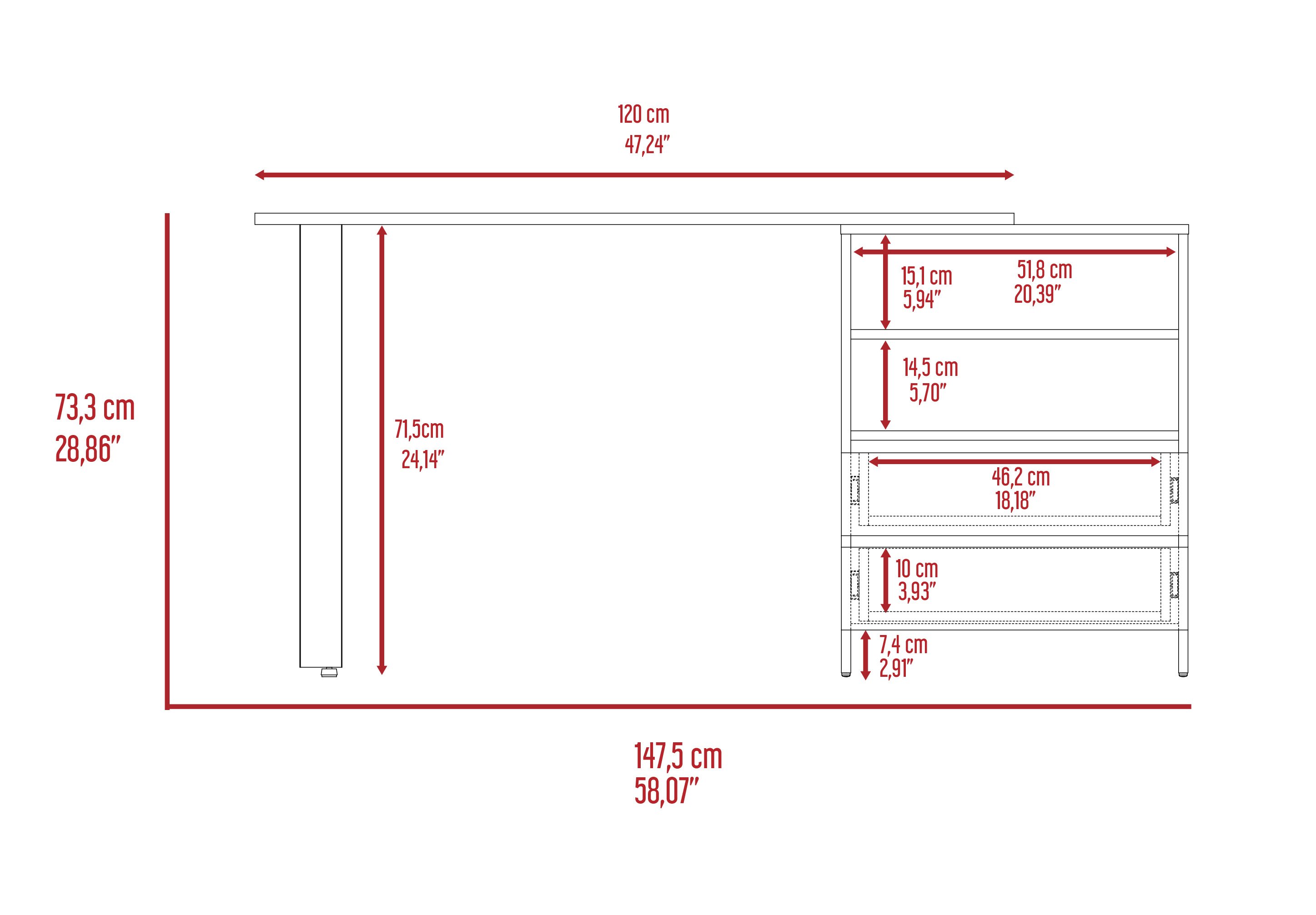 Desk top surface is 47.2" W x 23.6